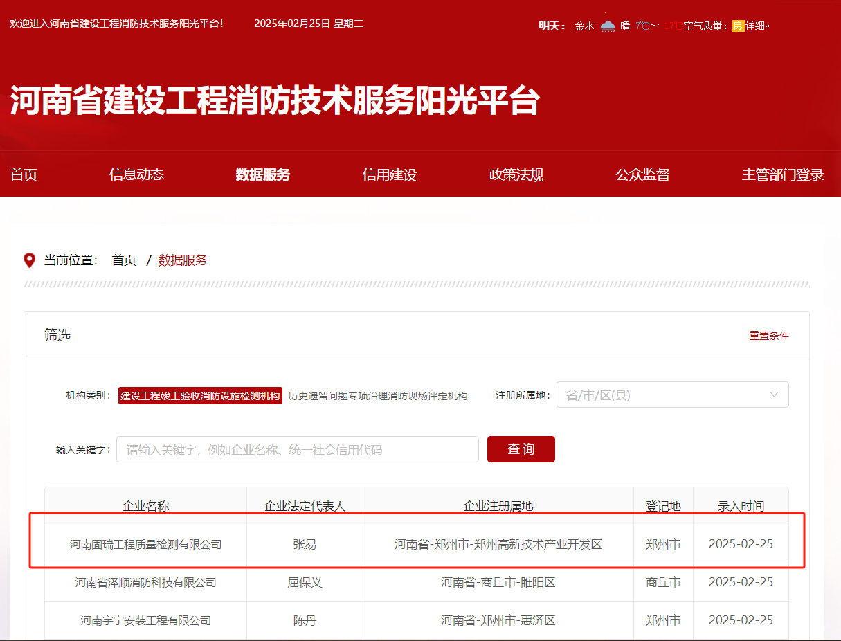 熱烈祝賀河南固瑞工程質(zhì)量檢測(cè)有限公司入冊(cè)河南省建設(shè)工程消防技術(shù)服務(wù)陽光平臺(tái)!!!